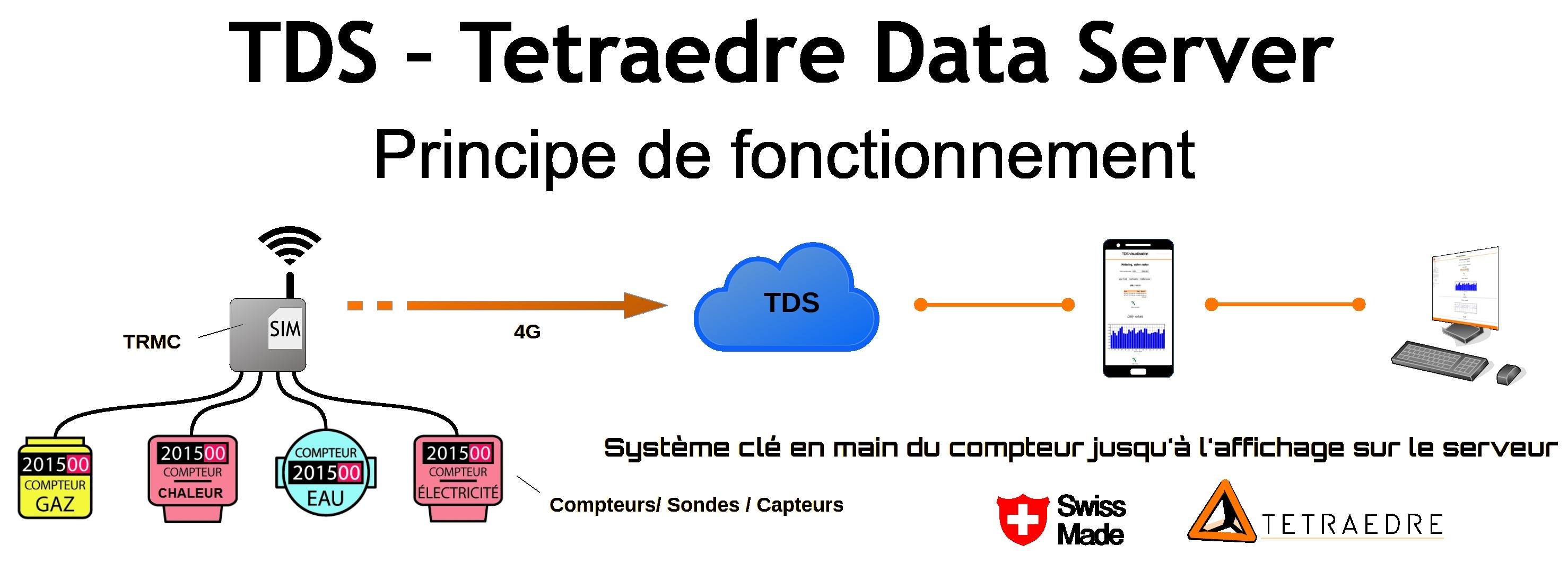 Tetraedre propose le logiciel TDS™, qui enregistre toutes les données envoyées par un ou plusieurs TRMC™. C'est un système qui fonctionne au travers d'une page web. Facile d'utilisation et convivial, vous pouvez lire les valeurs de vos appareils de mesures sur votre ordinateur presque instantanément. Les données peuvent être représentées sous formes graphiques ou de manière brute.