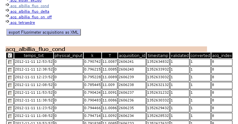Pour visualiser ces données, il faut aller dans la section manage de TDS, choisir le contexte physique puis aller dans Acquisitions (valeurs brutes). Là, choisissez les dates qui vous intéressent puis cliquez sur "Mettre-à-jour". Ensuite cliquez sur les liens. acq_albillia_fluo_cond, acq_albillia_fluo_delta, acq_albillia_fluo_on_off. La table acq_albillia_fluo_cond contient les valeurs du conductimètre du fluorimètre. La table acq_albillia_fluo_delta contient les valeurs ON-OFF (différence entre le mesure avec la LED allumé et mesure avec la LED éteinte) des détecteurs optiques du fluorimètre. La table acq_albillia_fluo_on_off contient les valeurs avec la LED allumée ainsi que les valeurs avec la LED éteinte. Normalement, la table acq_albillia_fluo_on_off est la table la plus intéressante.