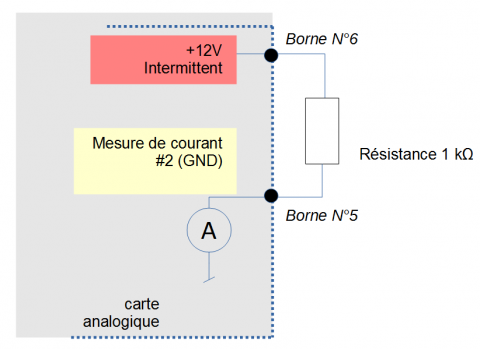 - Afin de s'assurer du bon fonctionnement des canaux de mesure du courant de la carte analogique, vous pouvez connecter une résistance de 1 kΩ entre les bornes 5 et 6 de la carte analogique.