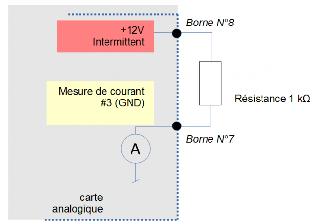 - Sur le même principe que pour le canal 2, afin de s'assurer du bon fonctionnement des canaux de mesure du courant de la carte analogique, vous pouvez connecter une résistance de 1 kΩ entre les bornes 8 et 7 de la carte analogique.